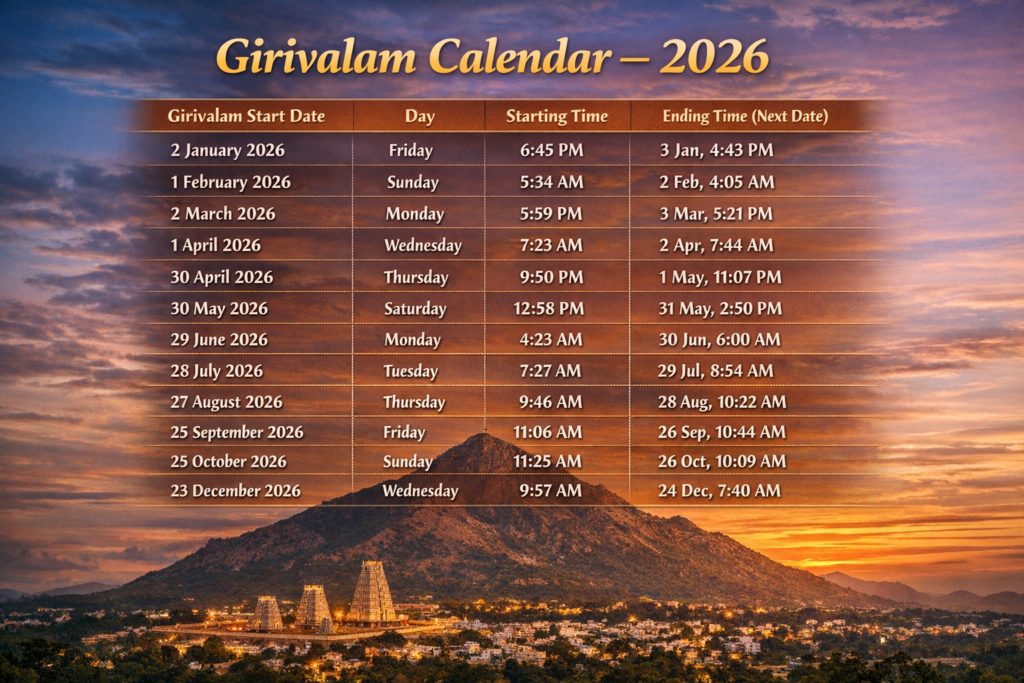 Girivalam (Giri Pradakshina) is the circumambulation of Arunachala Hill on foot. Devotees walk clockwise around the hill, usually along a road of about 14 km. Many people do Girivalam on full moon nights, but you can do it on any day.
